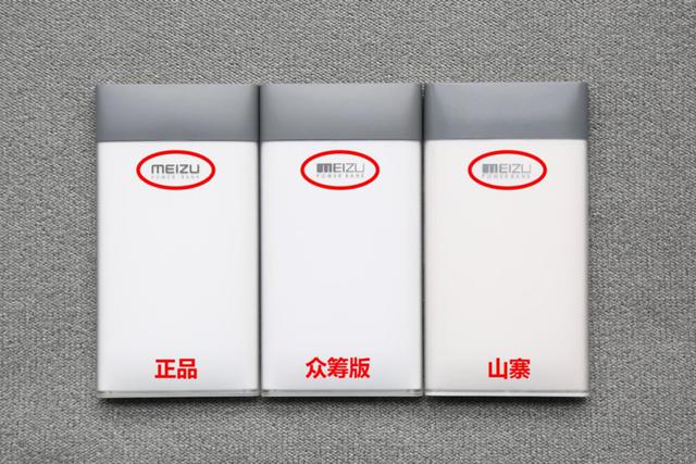 正品已经改用新版魅族LOGO,正面的mCharge贴纸也加上了“快充”字样;山寨版采用的LOGO和众筹版一样是旧版,前者印刷字体的颜色较浅,不一定能分辨出来,不过还可以从mCharge贴纸粘贴位置区分:众筹版贴于右侧上方,山寨版贴在正面。