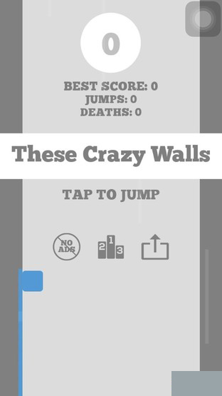 《These Crazy Walls》由开发商Josiah Jenkins推出,界面设计十分简洁,界面以灰色和白色为主色调,唯一的一抹亮色便是玩家所控制的小方块。游戏主界面会显示游戏的最好成绩,仅有排行榜、分享和免广告(需要付费)三个按钮。