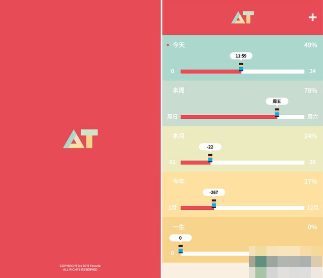 AT这款应用界面配色很清新,红色的进度条比较醒目。在每个计时条上都有一个抽象的人物,这个小人在不断前进仿佛时间也在跳动。