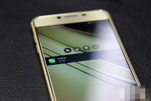 在锁屏界面上,三星Galaxy C5除了左右两个通话、相机快捷键以外,对于通知也有一定的优化,一般情况下,手机的锁屏界面显示应用推送内容,可一旦消息过多就会出现满屏消息的状况,在Galaxy C5通知则会以4个小圆圈图标显示,依次点击相应图标就会出现内容,想要查看多个通知只需要点击最后一个图标即可,简洁且不失高效性。