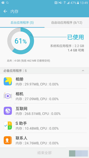 该智能管理器人性化之处在于自动,例如长期不使用的应用自动关闭其自动运行权限,久而久之你的手机就更加流畅,另外笔者测试中发现智能管理对于应用偷跑行为也有一定的效果。众所周知百度应用系列生命力极强,笔者尝试开启手机百度后关闭,用以测试应用是否存在偷跑行为,一段时间测试后发现,三星Galaxy C5后台只有一些必备的应用在使用内存,并不存在手机百度。