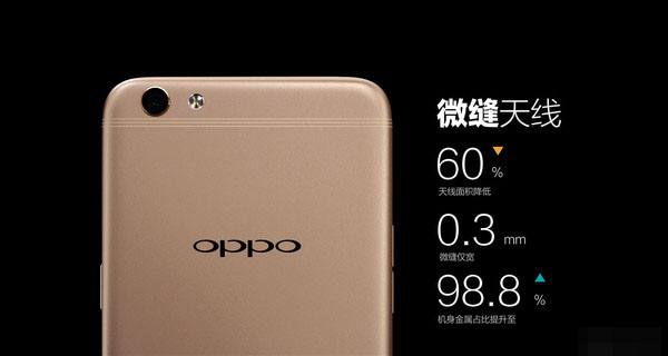 背面是R9s区别于R9的地方。OPPO R9s采用了微缝天线设计,将目前绝大多数Android手机上1.5-2mm宽的天线编程3条宽度仅为0.3mm的细线,使得天线总面积降低60%,进一步提高了手机的金属占比。