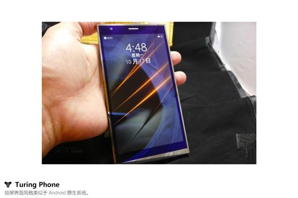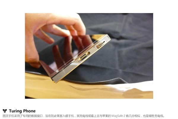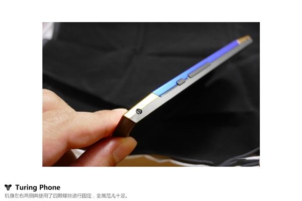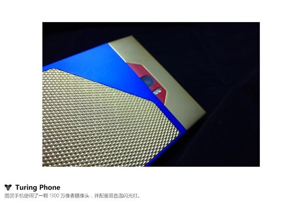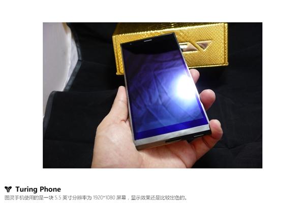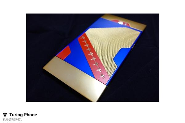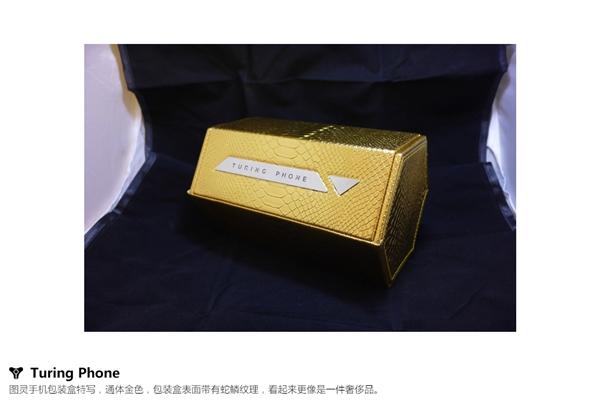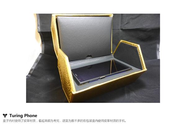 图灵手机金色版的包装看起来十分奢华,盒内采用皮革材质,机身采用独家的Liquidmorphium液态金属合金,其硬度超过钛合金和钢,中段则加入24K金。
